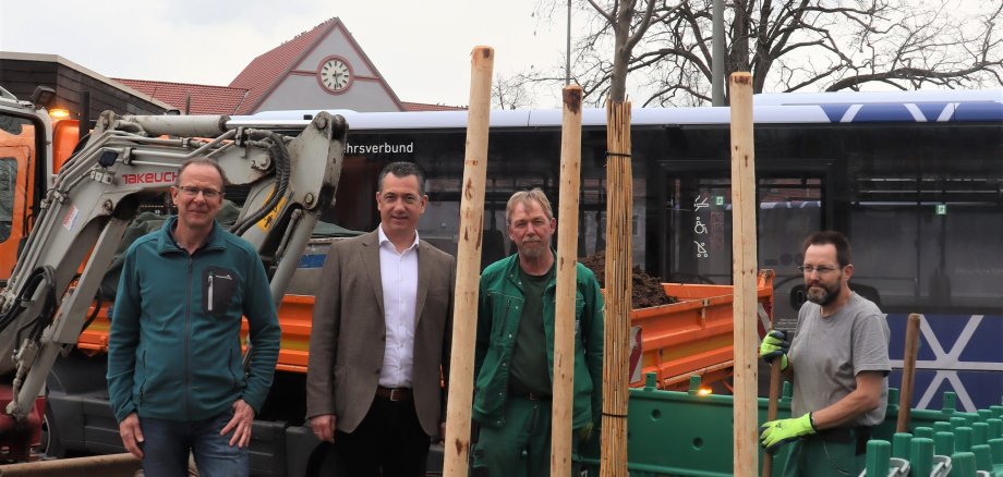 Foto (v.l.): Hans Sifft, fachliche Leitung Grün- und Freiflächen des Stadtbauamts, OB Emanuel Letz, sowie Mitarbeiter des Bauhofs, die am Busbahnhof einen „Klimabaum“ pflanzen. Foto: Isabel Gemperlein