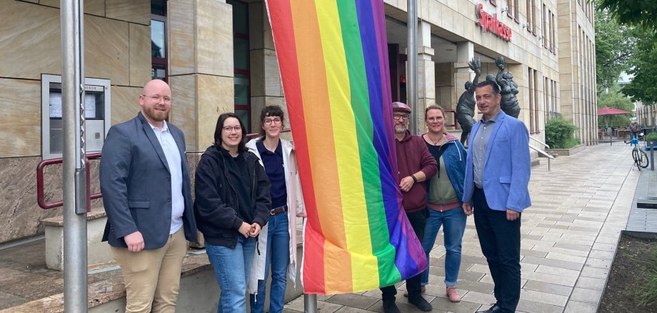 Foto: OB Emanuel Letz hisste mit der Stadtjugendförderung und dem QueerTreff die Pride Flag am neuen Rathaus. Mit dabei: Marvin Jung, Leiter des Amts für Kinder und Jugend (links). Foto: Isabel Gemperlein