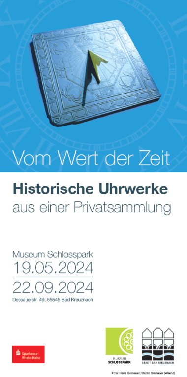 Am internationalen Museumstag eröffnet das Museum Schlosspark die Ausstellung „Vom Wert der Zeit“. In der neusten Sonderausstellung werden historische Uhrwerke aus einer bedeutenden Privatsammlung präsentiert, welche die Vielfalt des Uhrenmacherhandwerks aus verschiedenen europäischen Ländern und Epochen aufzeigt. Lassen Sie sich verzaubern durch die Schönheit und Mechanik der interessanten historischen Zeitmessgeräte. Gelegentlich werden die Uhren in Gang gesetzt: Das Funktionieren der unterschiedlichen Werke, das abwechselnde Ticken und der markante Glockenschlag lädt zum Verweilen, Betrachten und Hinhören ein. Ein Erlebnis für Jung und Alt im Museum Schlosspark Bad Kreuznach.