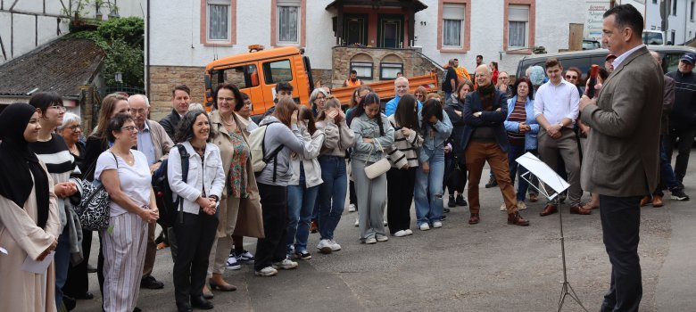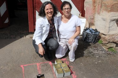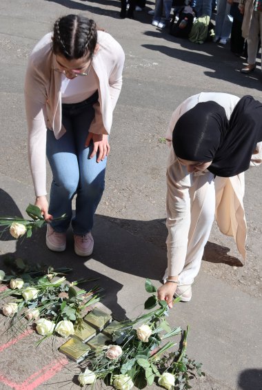 Die beiden Kusinen waren vom Empfang und der feierlichen Zeremonie wie alle Teilnehmer emotional berührt. Schülerinnen und Schüler der IGS Sophie Sondhelm, die seit Jahren die Stolpersteinverlegungen und Gedenkveranstaltungen mitgestalten, hatten Schautafeln mit Fotos und Infos mit den Stammbäumen der beiden Familien erarbeitet, Das Material hierzu hatten ihnen Stadtarchivarin Franziska Blum-Gabelmann, Karl-Ernst Laubenstein und Stefan Köhl zur Verfügung gestellt. Außerdem beeindruckten sie mit einem szenischen Spiel, bei dem sie Schautafeln mit der Mahnung "Auschwitz ist nicht vom Himmel gefallen" in die Höhe hielten.