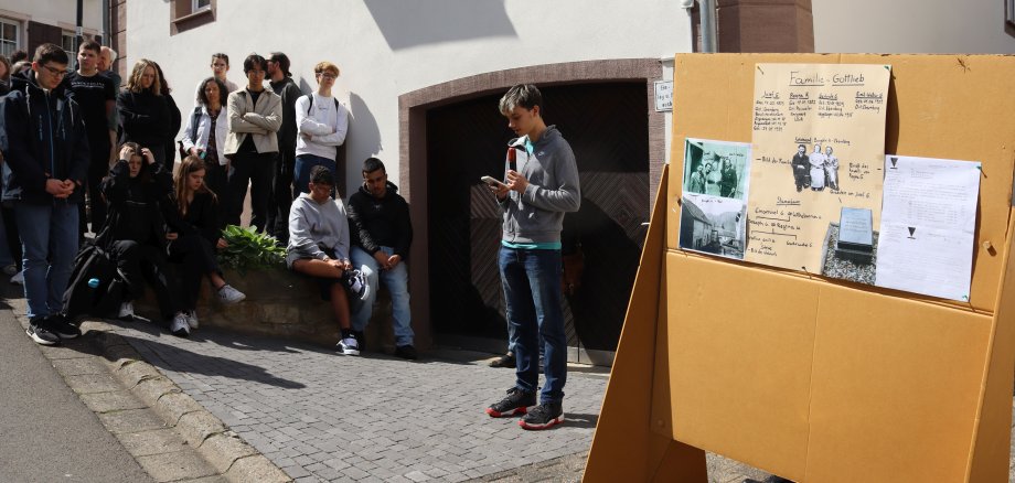 Foto oben: Zwei Stolpersteine für das Ehepaar Gottlieb wurden in der Burgstraße 4 verlegt. Schüler und Schülerinnen der IGS Sophie Sondhelm erarbeiteten dazu Infotafeln.
