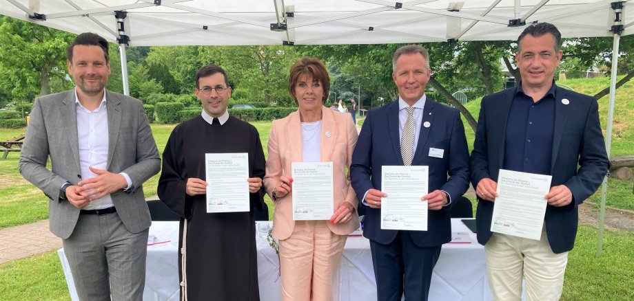 Großes Foto: Unterzeichneten die Charta für Vielfalt (v.r.): OB Emanuel Letz, Dr. Thorsten Junkermann (stellvertretender Geschäftsführer des Landeskrankenhauses), Steffi Meffert (Aufsichtsratsvorsitzende der Meffert AG Farbwerke) und Bruder Michael Rüdin (Vorstandsvorsitzender der Franziskanerbrüder vom Heiligen Kreuznach). Links im Bild: Daniel Stich, Ministerialdirektor im Ministerium für Wirtschaft und Gesundheit Rheinland-Pfalz. Fotos: Isabel Gemperlein