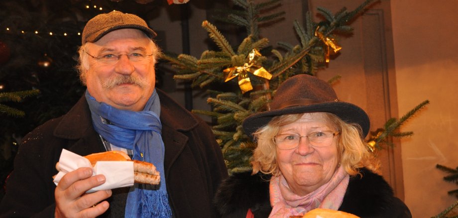 Foto: Mit seiner Frau Charlotte Dominjon war Gérard Lora-Tonet häufig Gast in Bad Kreuznach. Wie viele Bourger liebte er die deutsche Bratwurst. Das Foto wurde 2018 auf dem Nikolausmarkt aufgenommen. Foto: Heike Rehbein