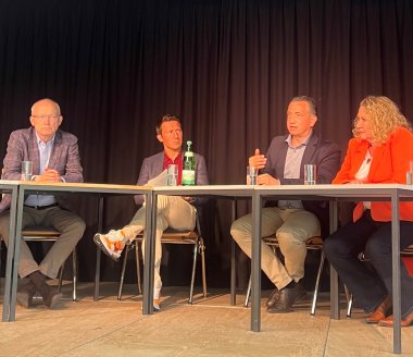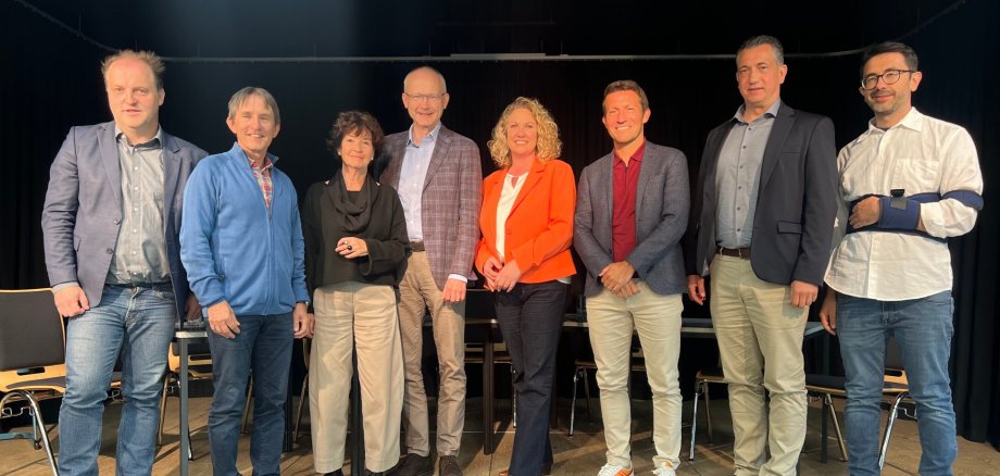 Großes Foto: Gruppenbild der Podiumsteilnehmer aus der Kommunal- und Landespolitik. Foto: Nathalie Herberger