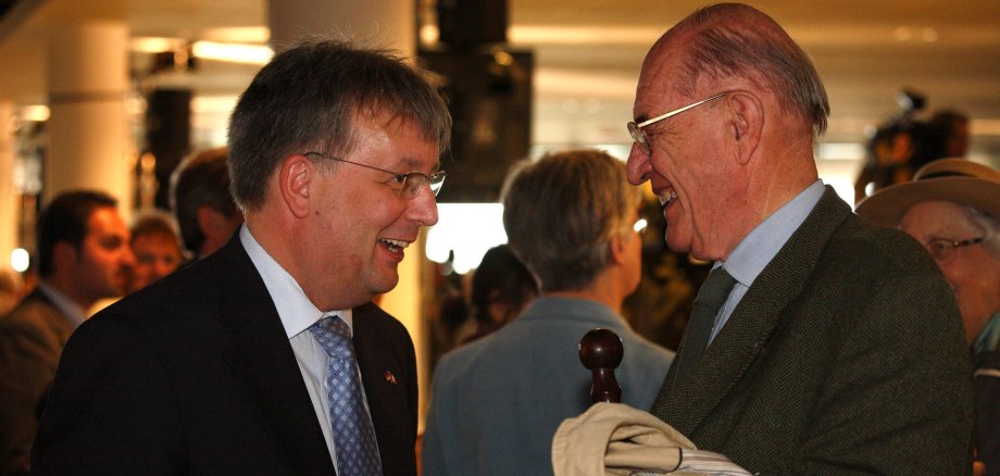 Großes Foto: Herzliche Begrüßung: Bei der Einweihung des Memorial Charles de Gaulle am 10. Oktober 2008 lernte Oberbürgermeister Andreas Ludwig einen Neffen de Gaulles, Bernard de Gaulle (1923-2019), kennen. Als Offizier war Bernard de Gaulle in der französischen Besatzungszeit nach dem Zweiten Weltkrieg bei einer Familie in Monzingen einquartiert. Foto: Ingo Espenschied