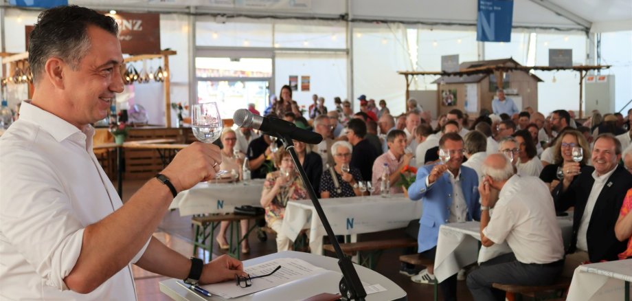Großes Foto: Die Rede von OB Emanuel Letz zum kommunalpolitischen Frühschoppen im Naheweinzelt wurde mit viel Beifall bedacht. Text und Fotos: Hansjörg Rehbein