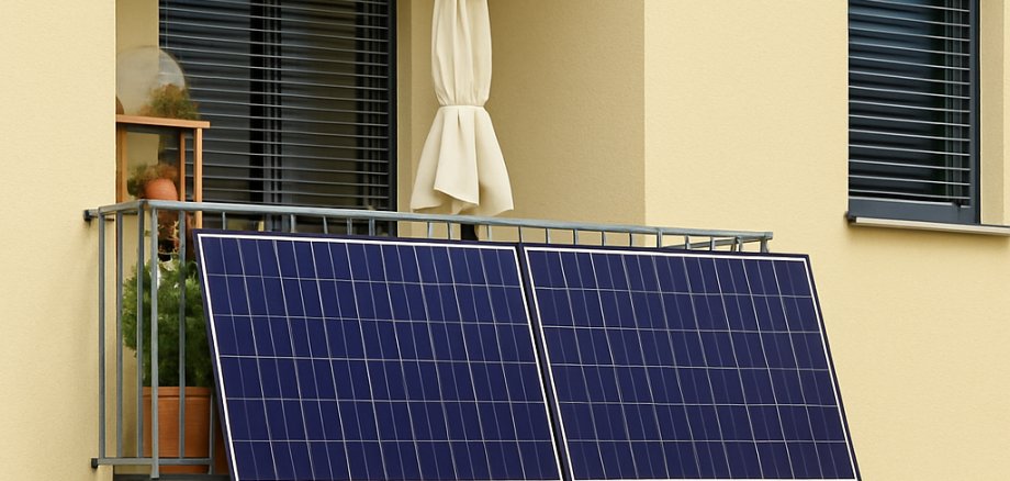 Symbolfoto: Balkon eines Mehrfamilienhauses mit Photovoltaikmodulen