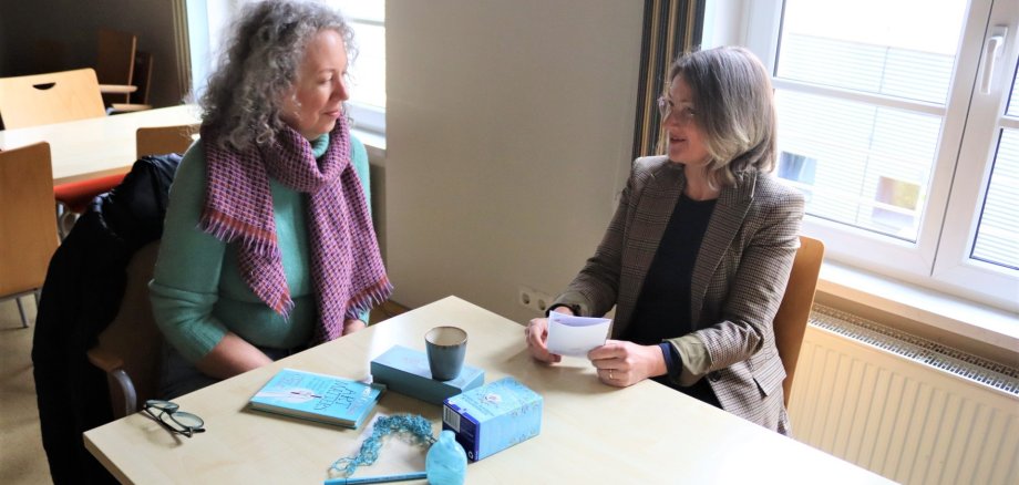 Foto: Simone Dengel (rechts), Geschäftsführerin der vhs Bad Kreuznach, im Gespräch mit Elke Aybar, die unter dem Motto „Gemeinsam statt einsam“, Menschen zusammenbringt. Dabei helfen Gespräche über Lieblingsgegenstände aus dem Alltag. Foto: Hansjörg Rehbein