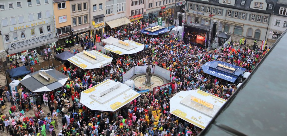 Archivfoto (2024): Im "Narrenkäfig" auf dem Kornmarkt und in der Rossstraße feiern alljährlich tausende Närrinnen und Narren