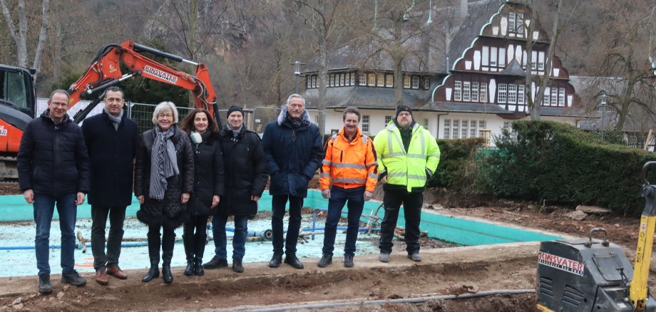 Foto: Vor dem 40 Tonnen schweren Technikschacht stehen von links Hans Sifft, Emanuel Letz, Birgit Ensminger-Busse, die Ortsbeiratsmitglieder Anke Altmayer und Michael Dal Magro, Norbert Welschbach (Stadtrats- und Ortsbeiratsmitglied), Wolfgang Loeser (Ingenieurbüro Giloy & Loeser), Kai Schneider (Baufirma Kinsvater).