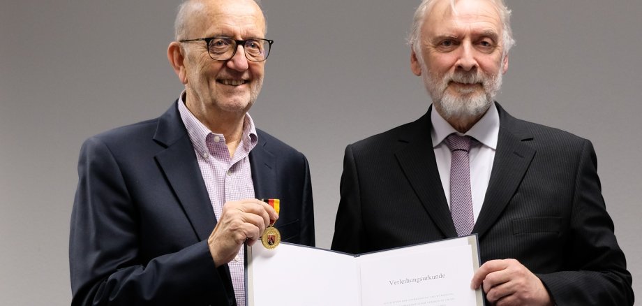 Foto: Arno Lergenmüller (links) nahm von Prof. Dr. Jürgen Hardeck die Auszeichnung entgegen. Foto: Ministerium für Familie, Frauen, Kultur und Integration