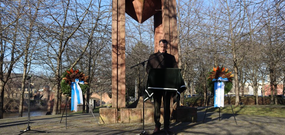 Archivfoto: OB Emanuel Letz bei seiner Rede anlässlich der Gedenkveranstaltung in der Kirschsteinanlage 2024