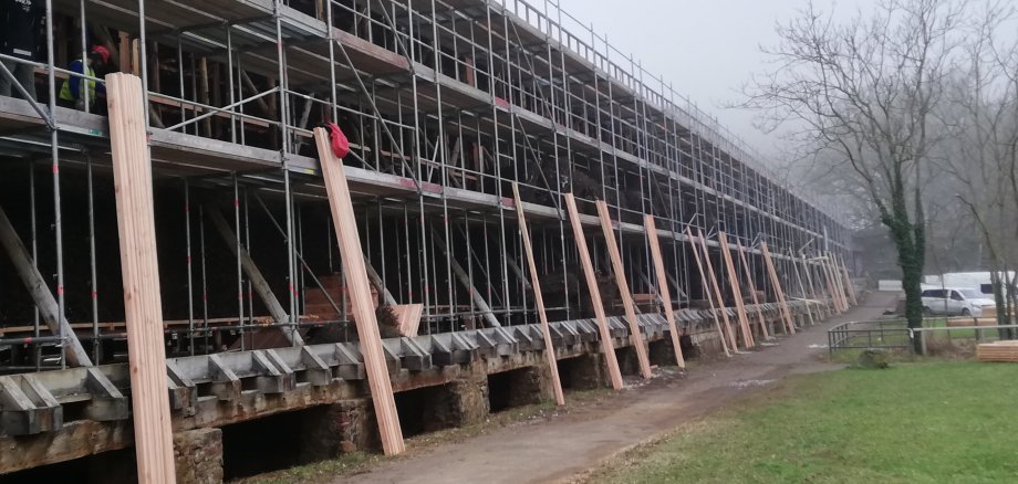 Auch im Kurpark Bad Münster am Stein wird weiter am Gradierwerk gearbeitet. Nachdem hier die Dornwände vollständig erneuert sind, müssen nun oben auf der Krone 300 Meter Geländer-Handlauf mit 150 Metern Pfosten das alte Material ersetzen. Die Arbeiten die Salinenarbeiter der GuT aus, es fallen hier 13.000 Euro Materialkosten an. Die Inbetriebnahme der Gradieranlagen ist nach derzeitigem Stand deutlich vor Ostern – Anfang April – geplant.