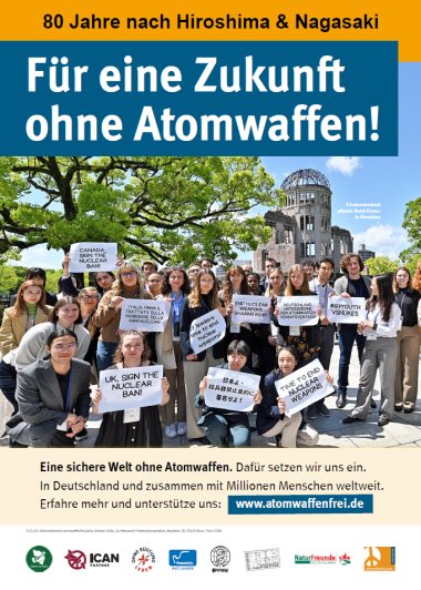 Unter dem Motto „80 Jahre nach Hiroshima & Nagasaki: Für eine Zukunft ohne Atomwaffen!“ ruft im Sommer eine Plakatkampagne in deutschen Großstädten zur Abschaffen von Atomwaffen auf. Die Kampagne des Aktionsbündnisses „atomwaffenfrei.jetzt“ wird vom Netzwerk Friedenskooperative, den Mayors for Peace Deutschland und weitere Organisation unterstützt.