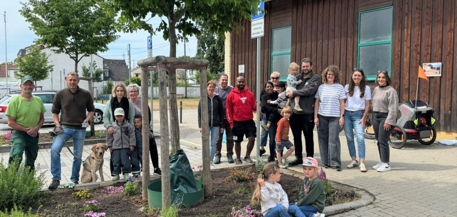 Foto: Zusammen mit den Kita-Sozialarbeiterinnen aus dem Sozialraum Winzenheim und Ortsvorsteher Mirko Kohl haben Familien die Beete am Scheunenplatz bepflanzt. Foto: Petra Bürkle