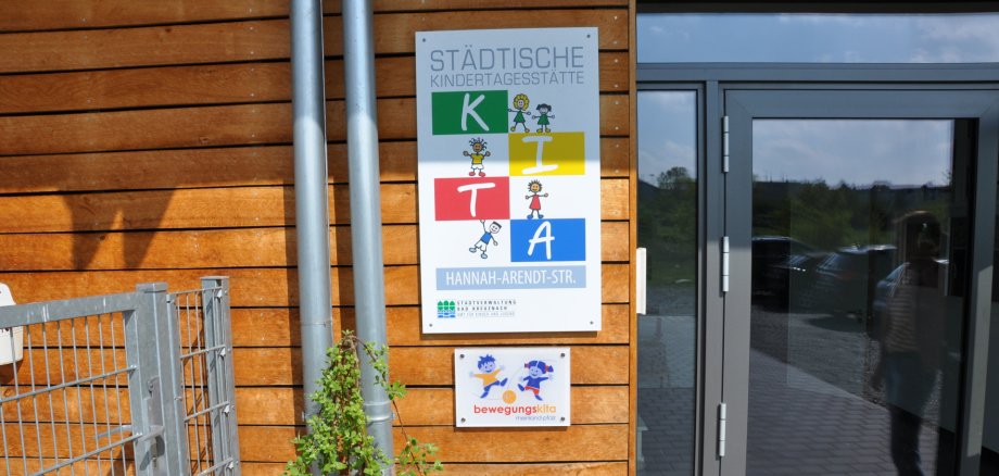 Archivfoto: Eingangsbereich der Kita Hannah-Arendt mit dem Türschild "Bewegungskita Rheinland-Pfalz". Foto: Isabel Gemperlein