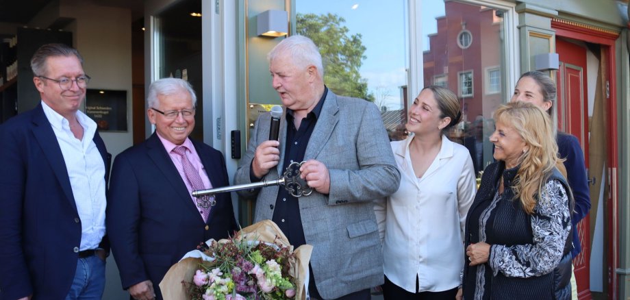 Großes Foto: An Alexander und Werner Klopfer (v.l.) überreichte Klaus Endemann im Beisein seiner Töchter Diana und Dunja und Ehefrau Dorothea den symbolischen Schlüssel. Fotos: Hansjörg Rehbein
