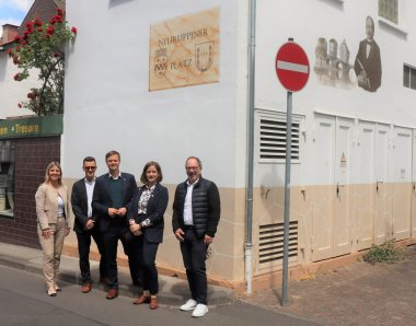 Ein weiterer Programmpunkt war der Besuch des im März eingeweihten neu gestalteten Neuruppiner Platzes. Der vorwiegend als Parkraum genutzte Platz in der Innenstadt war durch das Engagement zahlreicher Beteiligter verschönert worden – unter anderem durch ein Porträt Theodor Fontanes an der Trafostation der Stadtwerke sowie ein Brückenhaus und Noten aus Stahl auf einem neu angelegten Beet. Die Neuruppiner zeigten sich sehr angetan von dem Ergebnis. Ein prächtiges Exemplar einer Theodor-Fontane-Rose, welche die Neuruppiner Delegation als Gastgeschenk mitgebracht hatte, soll künftig den Platz zusätzlich schmücken.