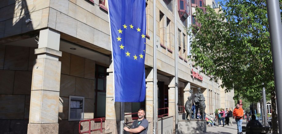 Foto: Zum Europatag hisste Hausmeister Thomas Richter für die Stadt Bad Kreuznach die Europaflagge vor dem Rathaus. Foto: Hansjörg Rehbein
