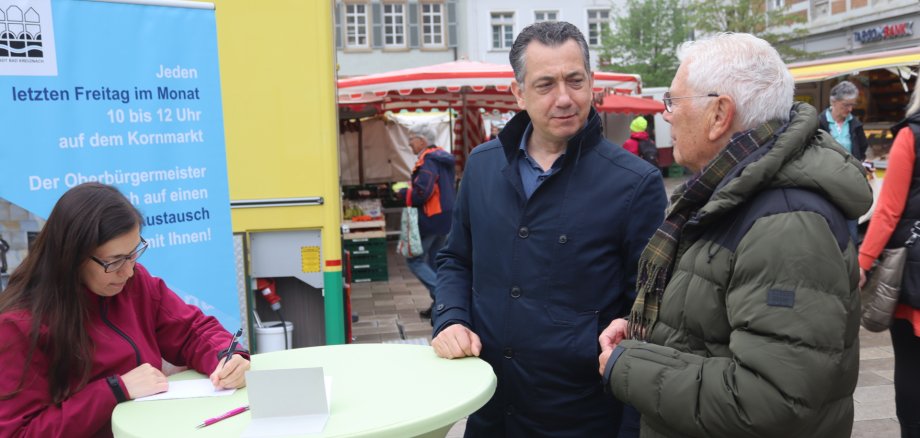 Foto: Dafür, dass die KRN-Linie 203 im Wohngebiet Rheingrafenblick einen kleinen Bus einsetzt, bedankte sich Anwohner Kunibert Schmalohr, Sprecher der Interessengemeinschaft Franziska-Puricelli-Straße beim OB, der sich über einen zweistündigen regen Meinungsaustausch mit Bürgerinnen und Bürgern an seinem Infostand freute.
