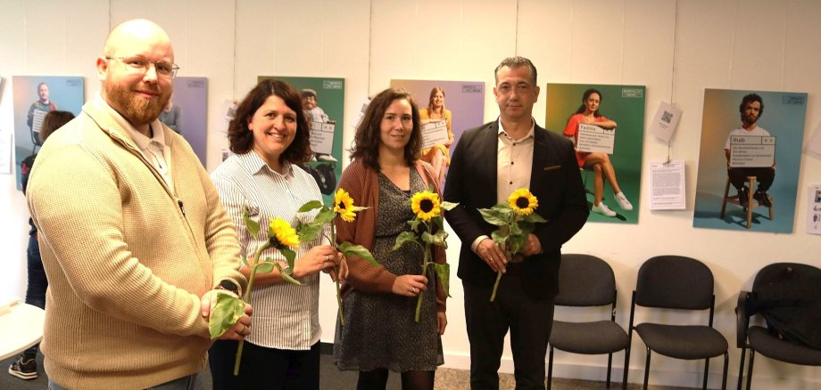 Foto: Das Bewusstsein für unsichtbare Beeinträchtigungen wird weltweit mit dem Symbol der Sonnenblume gestärkt. Dies zeigen auch Marvin Jung (Leiter Amt für Kinder und Jugend), Irina Söntgerath, Dagmar Roth und Emanuel Letz. Foto: Hansjörg Rehbein
