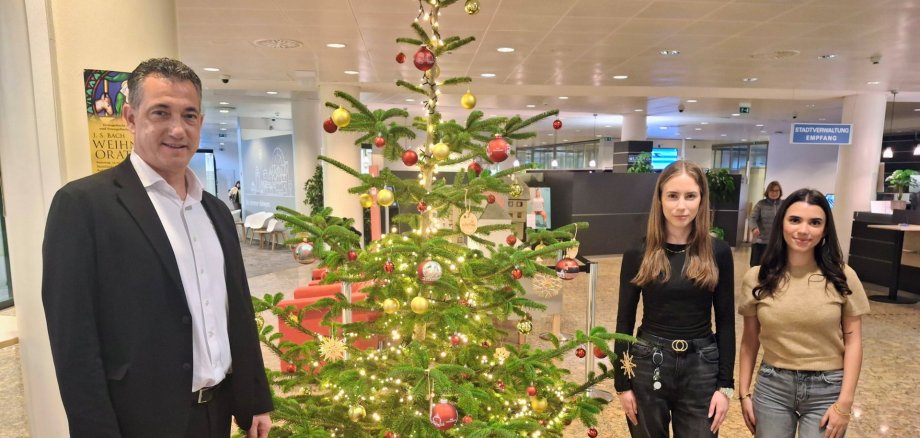 Großes Foto: Freuen sich über die geschmückten Tannenbäume im Rathaus (v.l.): OB Letz mit den Auszubildenden Evelyn Kopp und Melisa Martensen. Fotos: Isabel Gemperlein