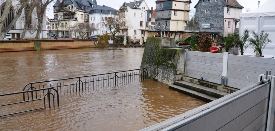 Archivfoto: Hochwasser im Februar 2020 am Mühlenteich an der Nahe. Die mobilen Stellwände dienen als Hochwasserschutz. Foto: Isabel Gemperlein