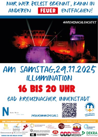 Das Führungstrio von „Wir sind Kreuznach“ dankt allen, die sich am Programm beteiligen. Sein besonderer Dank gilt den Unterstützern, darunter der Verkehrsverein Bad Kreuznach, die Unternehmensgruppe Kreuznacher Stadtwerke, Kreuznach Klassik, die Barbara-und-Rudi-Müller-Stiftung, das Medienkartell, ODD Print Medien, Dekra Bingen sowie Weinland Nahe. Nicht zu vergessen die Besucher des „VereinsFeierAbendMarktes“ am 11. September 2025, die dazu beigetragen haben, dass „Kreuznach leuchtet“ finanziert werden kann