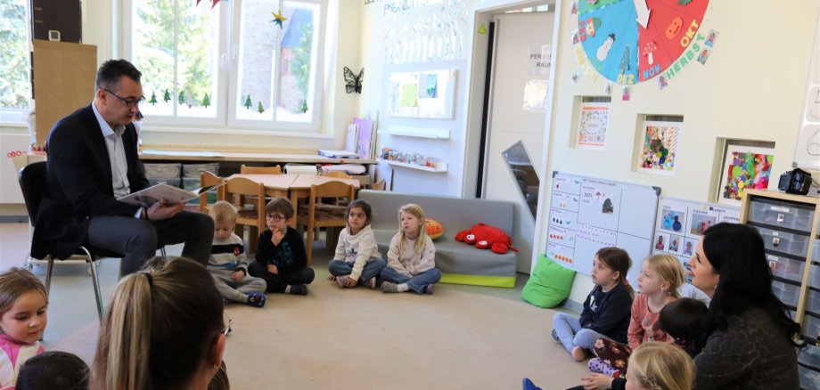 Oberbürgermeister Emanuel Letz besuchte die Kita Biebelsheimer Straße in Planig und wurde dort herzlich empfangen: Die Kinder der Schmetterlingsgruppe hatten ihm ein buntes Willkommensplakat gemalt. Auf seinem Stuhl lag schon das Buch bereit, aus dem Emanuel Letz den Vier- und Fünfjährigen vorlas. Die Kinder erfuhren, warum Frederick, die Feldmaus, nicht wie die anderen Mitglieder seiner Familie Futter für den Winter sammelte, sondern Sonnenstrahlen für die dunklen, kalten Wintertage. Und tatsächlich: Als alle froren, wärmte Frederick mit seiner fantasievollen Geschichte von der Sonne.