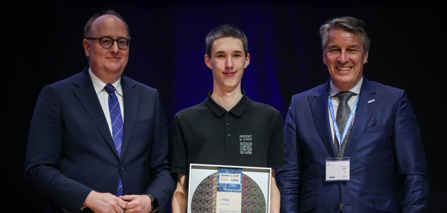 Text: Pressestelle VDE. Foto: Emil Kroisandt, Sieger INVENT a CHIP, mit Matthias Hauer (Parlamentarischer Staatssekretär BMFTR, links) und Alf Hendryk Wulf (VDE Präsident, rechts) © Hannibal / VDE
