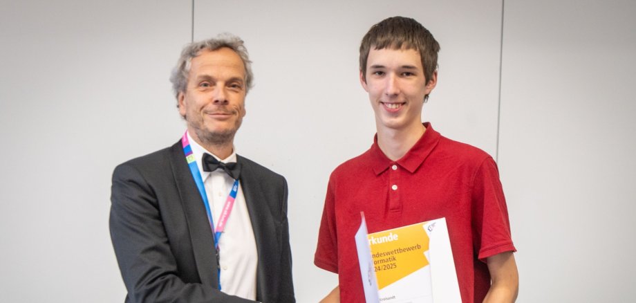 Foto: Der Beiratsvorsitzende des bundesweiten Informatikwettbewerbs, Professor Christoph Weidenbach, gratuliert Emil Kroisandt zum großen Erfolg. Foto: Andreas Heddergott