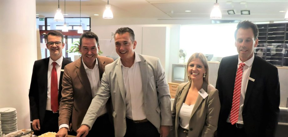 Großes Foto: Anschnitt des gemeinsamen Kuchens (v.l.): Jürgen Saurwein, Vertriebsdirektor Sparkasse Rhein-Nahe, Jörg Brendel, Vorstandsmitglied Sparkasse Rhein-Nahe, OB Emanuel Letz, Nathalie Herberger, Geschäftsleitung Stadtverwaltung Bad Kreuznach, und Timo Klein, Leiter Sparkassenfiliale am Kornmarkt. Fotos: Isabel Gemperlein