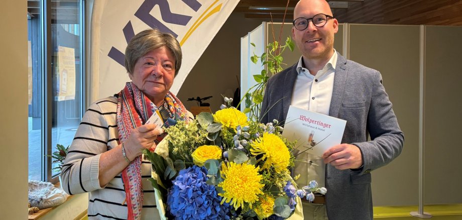 Foto: Brigitte Helfrich aus Bad Kreuznach ist die 10.000. D-Ticket Abo-Nutzerin der Kommunalverkehr Rhein-Nahe. Als kleines Dankeschön erhielt sie von Matthias Wölke, kaufmännischer Leiter der KRN, einen Blumenstrauß und einen Restaurantgutschein. Foto: Julia Stanger/KRN