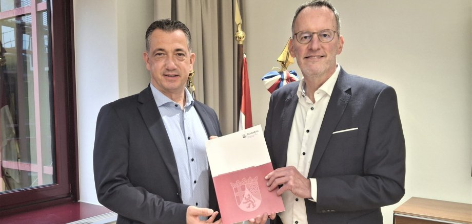 Foto: Minister Micheal Ebling (rechts) übergab den Förderbescheid im Rathaus an OB Emanuel Letz.
