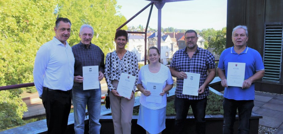 Foto (v.l.): Oberbürgermeister Emanuel Letz bedankt sich bei Günter Adelseck (Beförderung), Jutta Aff, Svetlana Jutkin, Marco Seibel und Michael Fickinger. Foto: Hansjörg Rehbein.