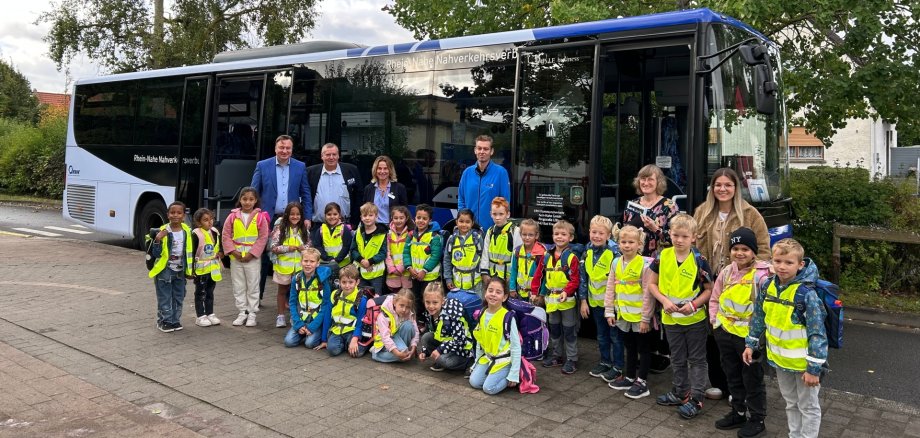 Foto: Busschule an der Grundschule Planig: Die Kinder der Klasse 1c mit Klassenlehrerin Frau Bertram, Schulleiterin Gabriele Anheuser, KRN-Geschäftsführer Uwe Hiltmann, RNN-Geschäftsführerin Silke Meyer sowie den Busschullehrern und Busfahrern Michael Bretzke und Frank Höpfner. Foto: RNN GmbH/Nasrin Mir Shakkeh