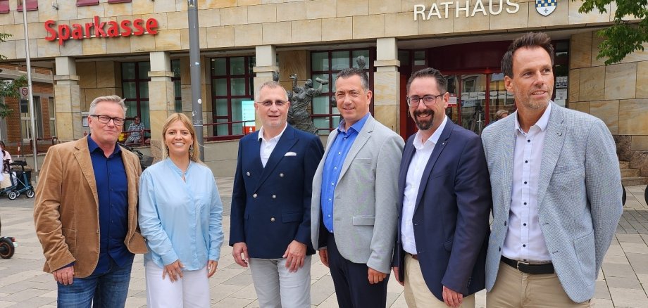 Freuen sich über die Präsentation der neuen Außenwerbung (Foto v. l.): Gert Ludwig, Abteilung Hochbau Stadtverwaltung, Nathalie Herberger, Geschäftsleitung Stadtverwaltung, Holger Wessling, Vorstandsvorsitzender Sparkasse Rhein-Nahe, OB Emanuel Letz, Michael Fluhr, Projektleiter Kornmarkt Stadtverwaltung, Timo Klein, Filialleiter Sparkassenfiliale Kornmarkt