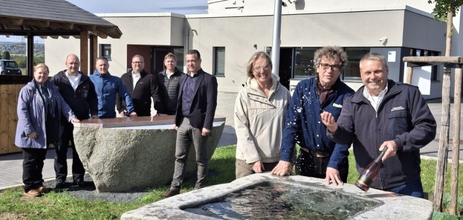 Foto: An der Einweihung der „Kunst am Bau“ an der Feuerwache Ost nahmen neben OB Emanuel Letz und dem Künstlerehepaar Livia Kubach und Michael Kropp auch Stadtbauamtsleiter Eduard Schuckmann, Projektleiterin Bianca Romeike, Michael Seibel und Peter Steinbrecher als Vertreter der Feuerwehr Bad Kreuznach sowie die Ortsvorsteher aus Planig und Bosenheim, David Feld und Markus Später, teil. Foto: Isabel Gemperlein