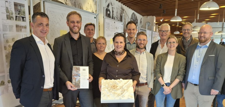 Großes Foto: OB Emanuel Letz (links) zeichnete den Entwurf von Fabian Thillmann und Melanie Scheeben von der Lindschulte Planungsgesellschaft aus Koblenz mit der Lindschulte Ingenieurgesellschaft aus Nordhorn aus. Mit dabei: Mitglieder der Jury des Realisierungswettbewerbs. Foto: Isabel Gemperlein