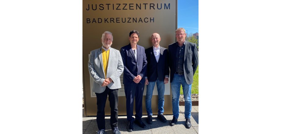 Foto: Sie gratulierten dem Jubilar (3.v.l.): Wolfgang Bartmann, Vorstandmitglied Bund Deutscher Schiedsmänner und Schiedsfrauen, Oliver Merten und Jürgen Cron, Amtsleiter Kommunales und Öffentlichkeitsarbeit, der im Auftrag von Oberbürgermeister Emanuel Letz die Glückwünsche überbrachte. Foto: Michael Schmidt