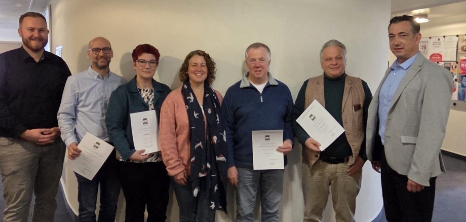 Foto: Sie stellten sich zum Erinnerungsfoto: Sammy Probsdorfer (Standesamt), Stefan Reithofer, Daniela Andel, Mareike Näher (Leiterin Bauhof), Peter Thielen, Thomas Busch, Emanuel Letz (von links). Foto: Nathalie Herberger
