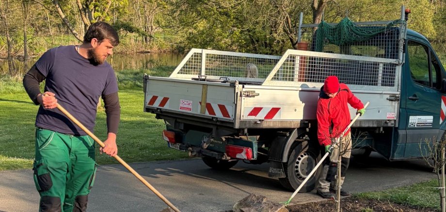 Foto: Bauhof-Mitarbeiter Bastian Kneib (links) pflegte zusammen mit dem Hospitanten ein Rosenbeet auf der Roseninsel. Foto: Tatjana Weber