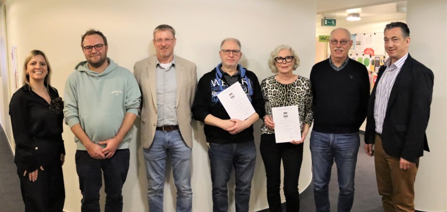 Foto von links: Nathalie Herberger (Geschäftsleitung), Carsten Schittko (Abteilungsleitung Stadtplanung und Umwelt), Jürgen Cron (Amtsleitung Kommunales und Öffentlichkeitsarbeit) und Oberbürgermeister Emanuel Letz (rechts) gratulierten Thomas Fischer (2.v.r.), Pia Gans (3.v.r. und Jürgen Schell (4.v.r). Foto: Hansjörg Rehbein