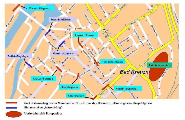 Von 10 bis 22 Uhr ist es in folgenden Straßen(-abschnitten) und Plätzen untersagt, alkoholhaltige Getränke mitzuführen oder zu konsumieren sowie Getränke aus Glasflaschen oder Gläsern zu trinken: