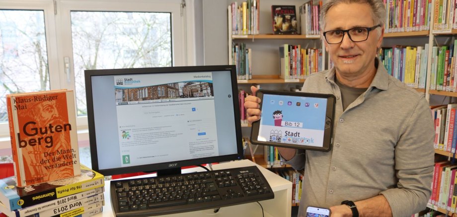 Foto: Lesestoff in klassischer Buchform, der digitale Medienkatalog auf dem Bildschirm, der Bibliotheksausweis auf dem Smartphone und die Homepage passgenau auf dem Tablet. Der Leiter der Stadtbibliothek, Stefan Meisel, präsentiert die vielfältigen Angebote seiner Einrichtung. Foto: Hansjörg Rehbein