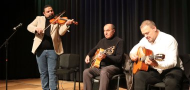 „Danke, dass sie uns mit offenen Armen empfangen haben“, wandte sich Torino Reinhardt direkt an den Oberbürgermeister. Der jüngste Sohn des legendären Schnuckenack Reinhardt (1921-2006), der in Weinsheim geboren wurde, gab mit seinem Bruder Forello und seinem Cousin Sascha, Sohn des populären Sintimusikers Daweli Reinhardt (1932-2016), eine Kostprobe des Könnens. Mal einfühlsam, mal temperamentvoll zum Entzücken der fast 200 Gäste in der Loge im Haus des Gastes. Sie bewahren das Vermächtnis ihrer Väter, die sich nach dem Zweiten Weltkrieg „trauten als Zigeunermusiker aufzutreten“, ihr Publikum begeisterten und zu Weltstars wurden. Damit machten sie auch den Weg für ihre Söhne und Enkel frei, die fast alle bekannte Musiker geworden sind.