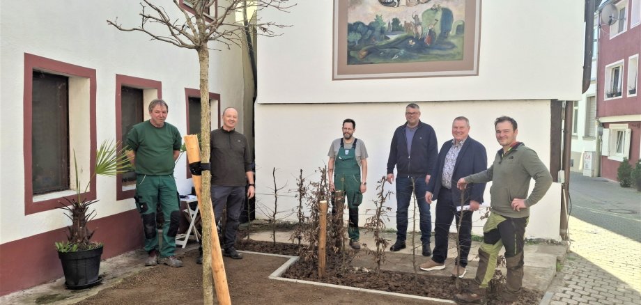 Großes Foto: Freuen sich über den neu gestalteten Platz in der Gerbergasse (v.l.): Thomas Berg, Andreas Foos, Frank Zimmermann (alle Mitarbeiter Bauhof), Oliver Kelm (Quartiersmanager), Bürgermeister Thomas Blechschmidt und Alexander Merz (Sachgebietsleiter Baumpflege). Foto: Isabel Gemperlein