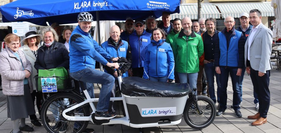 Foto oben: Oberbürgermeister Emanuel Letz (rechts) bedankte sich bei den Spenderinnen und Spendern des neuen E-Lastenrades und bei den ehrenamtlichen Fahrerinnen und Fahrern des KLARA-Lieferservices.