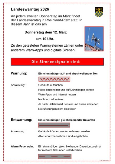 Nach Abschluss des Tests wird um 10.45 Uhr eine Entwarnung über dieselben Kanäle ausgegeben. Die Sirenen werden einen einminütigen, gleichbleibenden Dauerton angeben, der auch im Notfall das Ende der Gefahr anzeigt. Der Landesweite Warntag in Rheinland-Pfalz ergänzt den jährlich im September stattfindenden Bundesweiten Warntag.