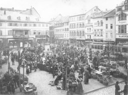 Die Foto- und Postkartensammlung bietet interessante Einblicke in die Geschichte der Stadt Bad Kreuznach, Zu sehen ist oben der Bismarckplatz (heute Kornmarkt) mit dem Wochenmarkt.